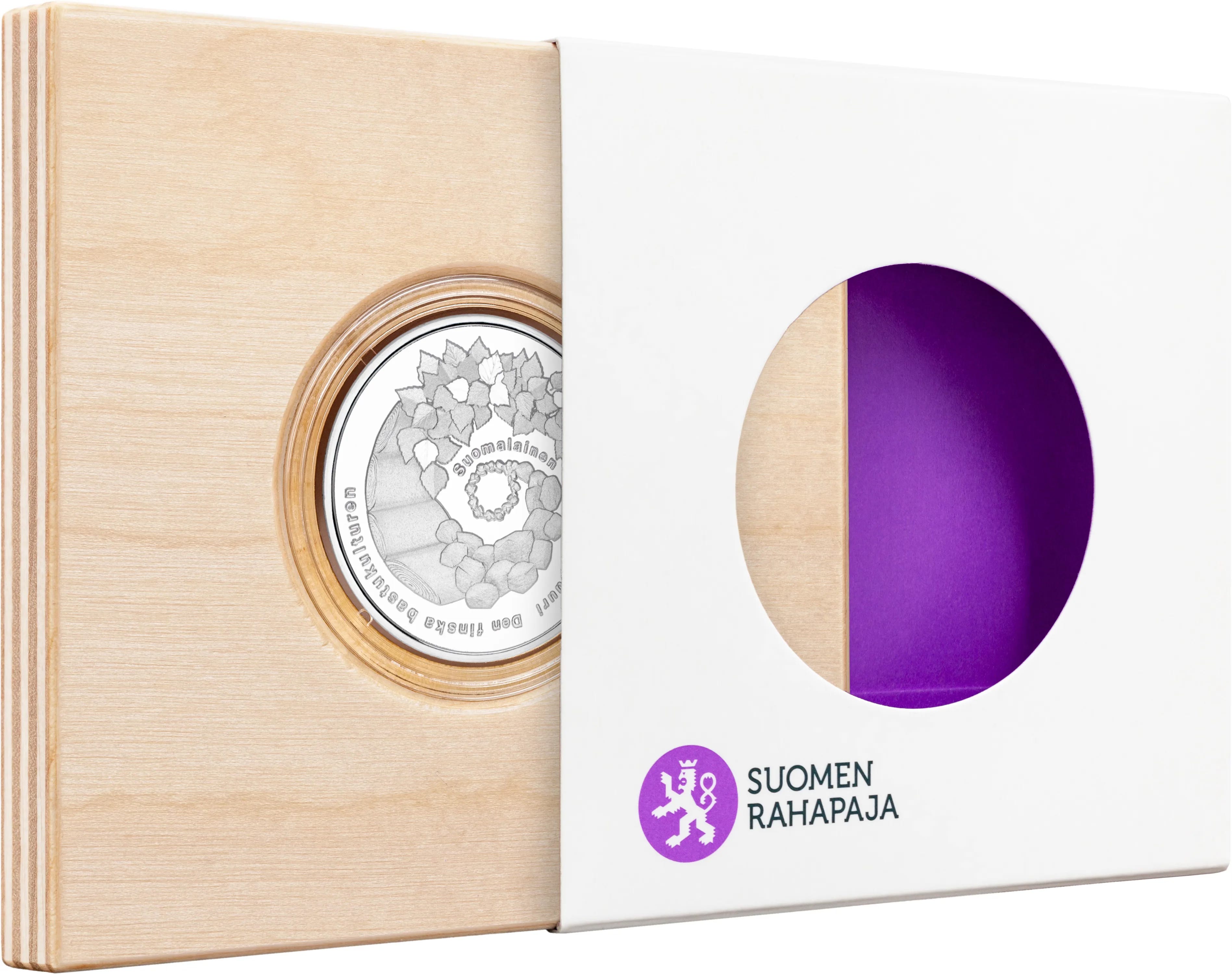 The Mint of Finland has created a series of collectable, silver sauna coins. The first one was released on Finnish sauna day — June 8, 2018. Erkki Vainio designed the sauna side of the coin, which features a lakseside sauna and several trailing smoke columns from neighboring saunas. The collectable coin is encased in plastic and set in a birch veneer frame made by Finnish carpenters Puusepänliike Wooden Oy.