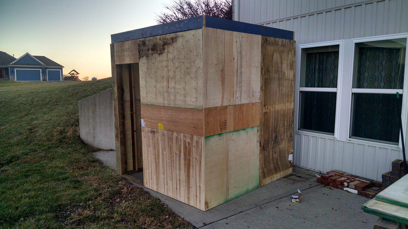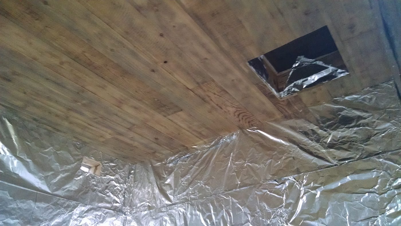 I set up a few Craigslist alerts on my phone to let me know when scrap wood, stove, chimney and other materials would pop up. I was able to source all of the wood for about $40, which included enough cedar for the interior and benches. Everything but the fasteners (nails, staples, rivets, and stove cement), vapor foil, thermometer, and the solar light is reclaimed. The insulation was leftovers from building my workshop, the stove came from a trade of reclaimed plywood, the chimney from Craigslist, some bricks from a house being torn down, the roof tar paper from a builder, the shingles from wood scrap, the flashing from aluminum scrap. I have about $380 into the project, with the biggest single expense, by far, being the chimney components.