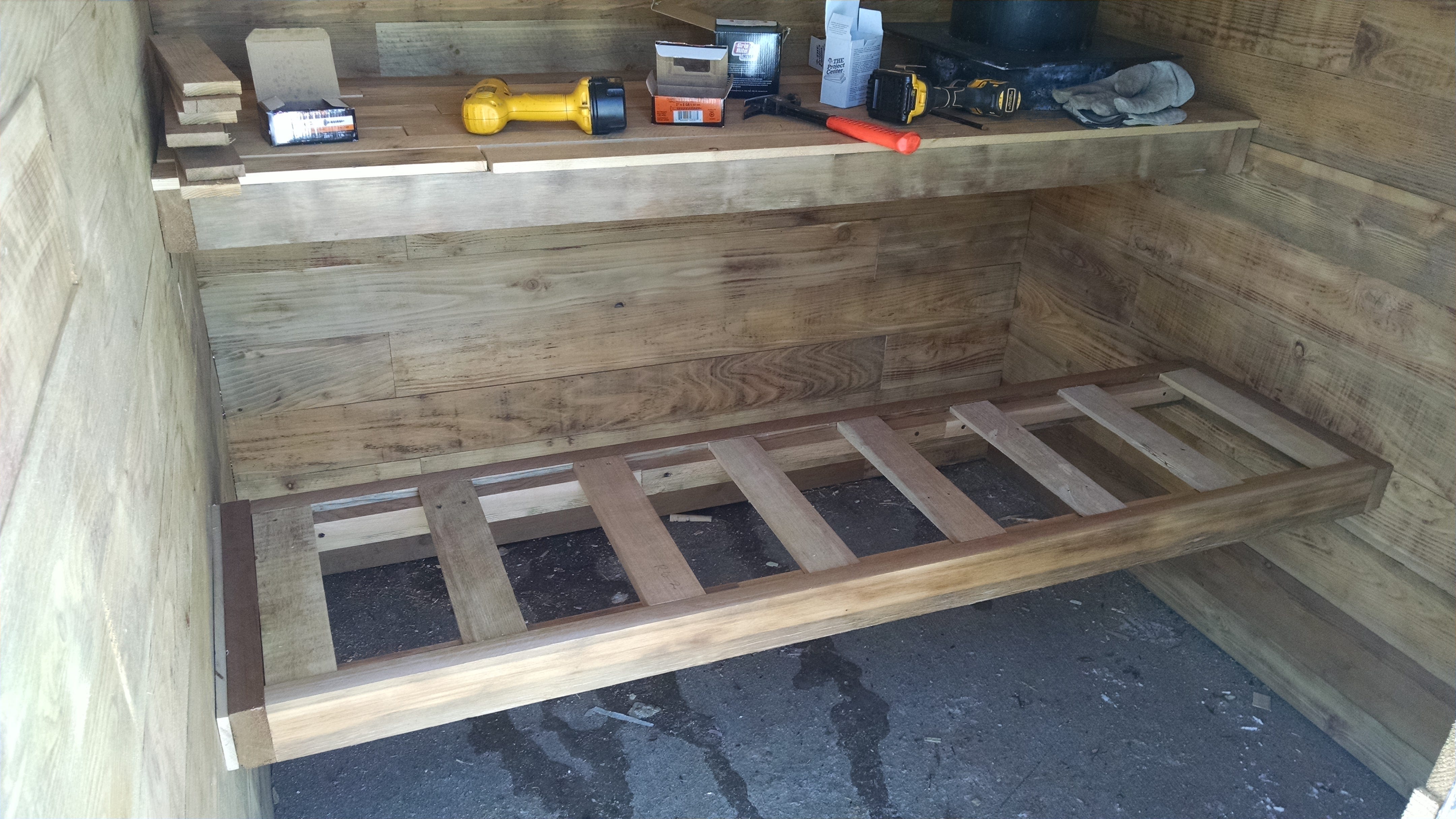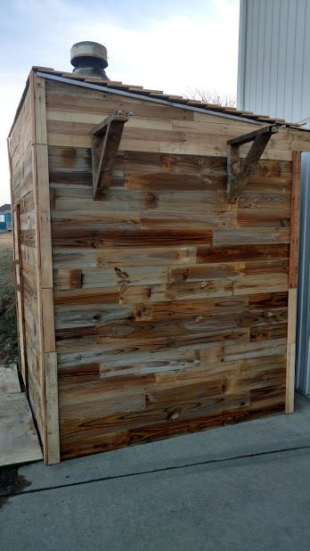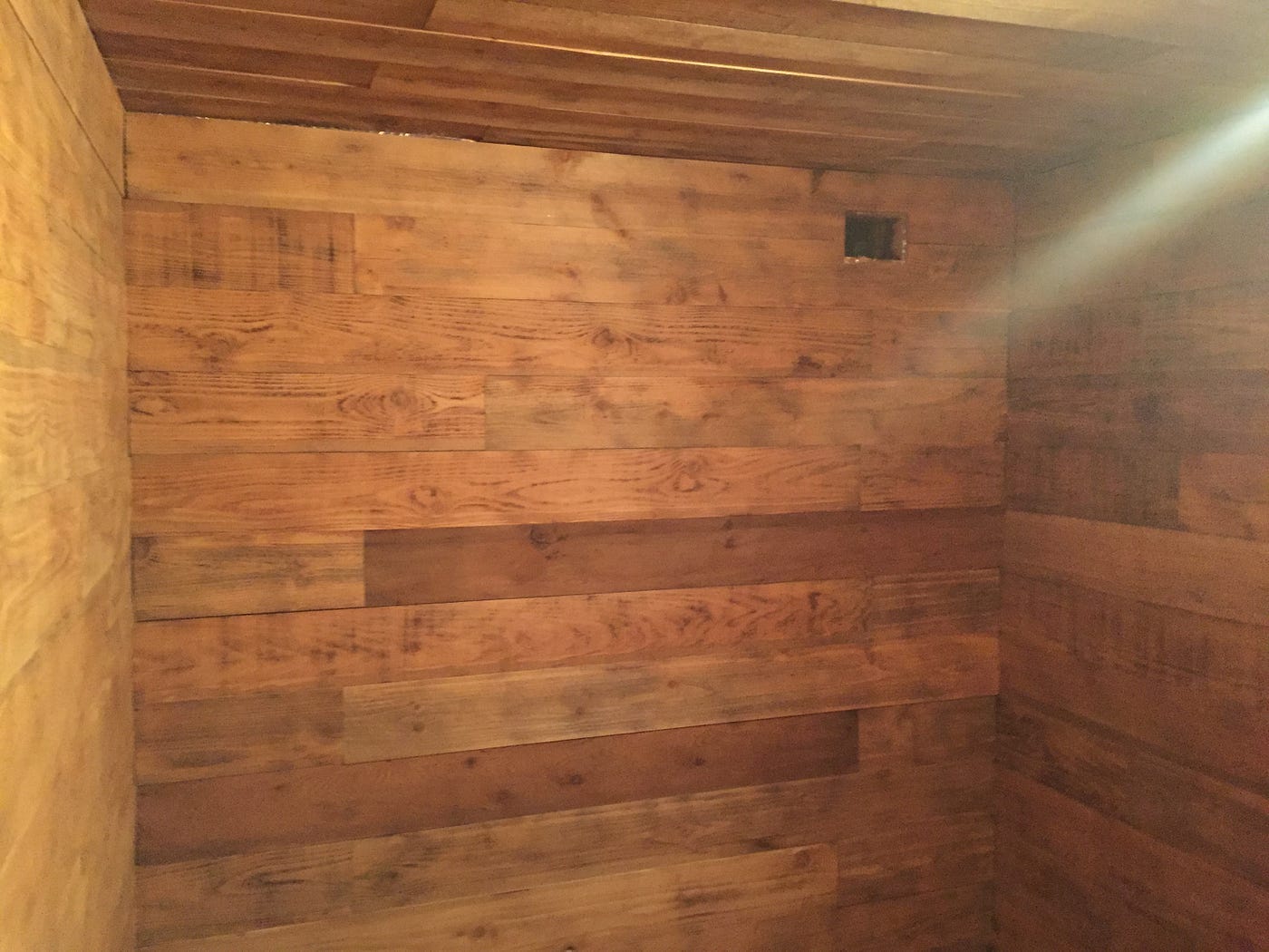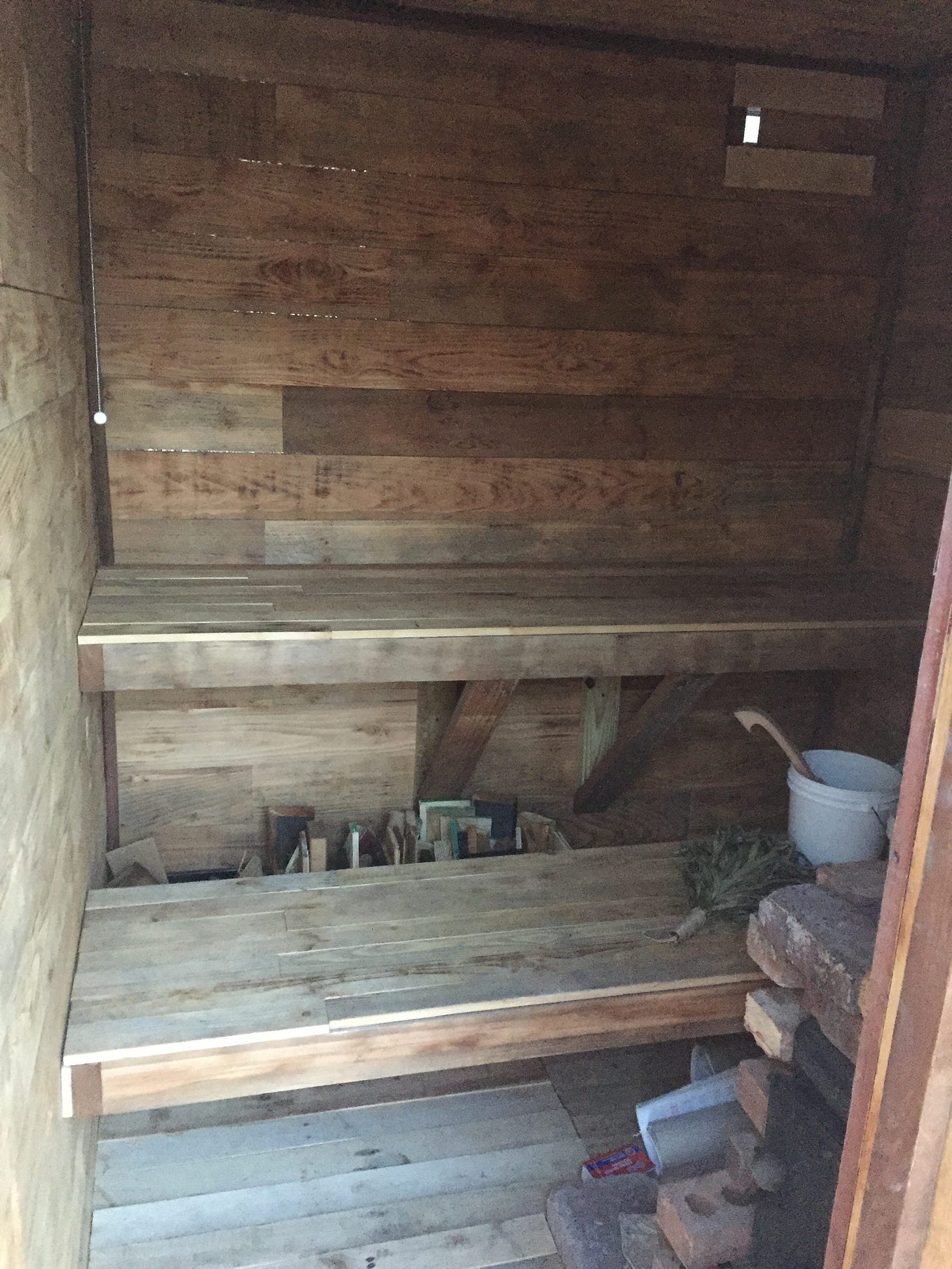 The layout is a simple, two parallel benches on one side, with the upper bench at 22" wide and the lower at 18". I made duckboard flooring out of old pallet slats I sanded; it is superb. I don’t dump a lot of water, but what gets dumped seems to run out fine. The door swings outward, with its placement all the way to the front left edge to maximize space. I thought about putting in a window, but the only reclaimed glass I had was too large. It wasn’t a big issue for me, and my wife prefers not to have one — so we don’t. I will probably have a window when I build a larger sauna, but for now, it’s fine.