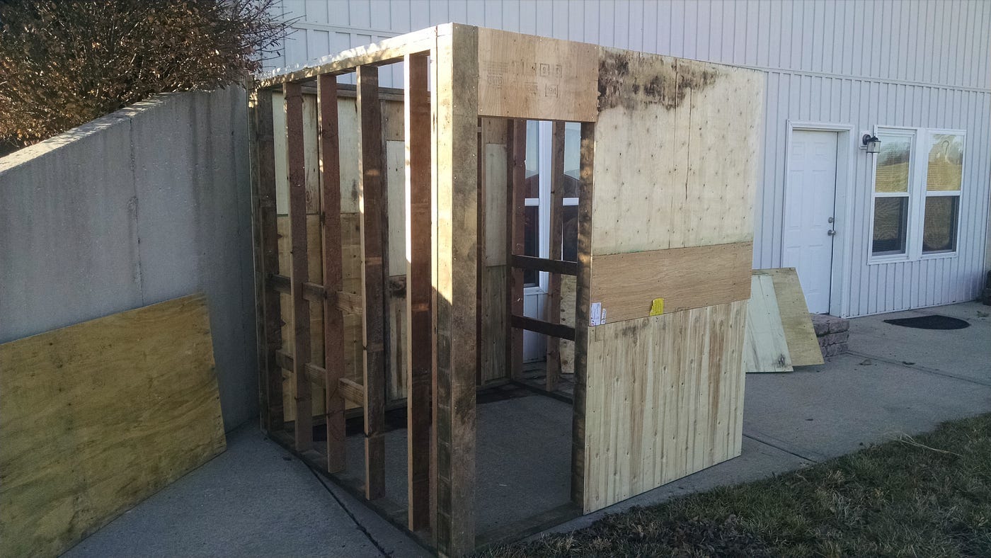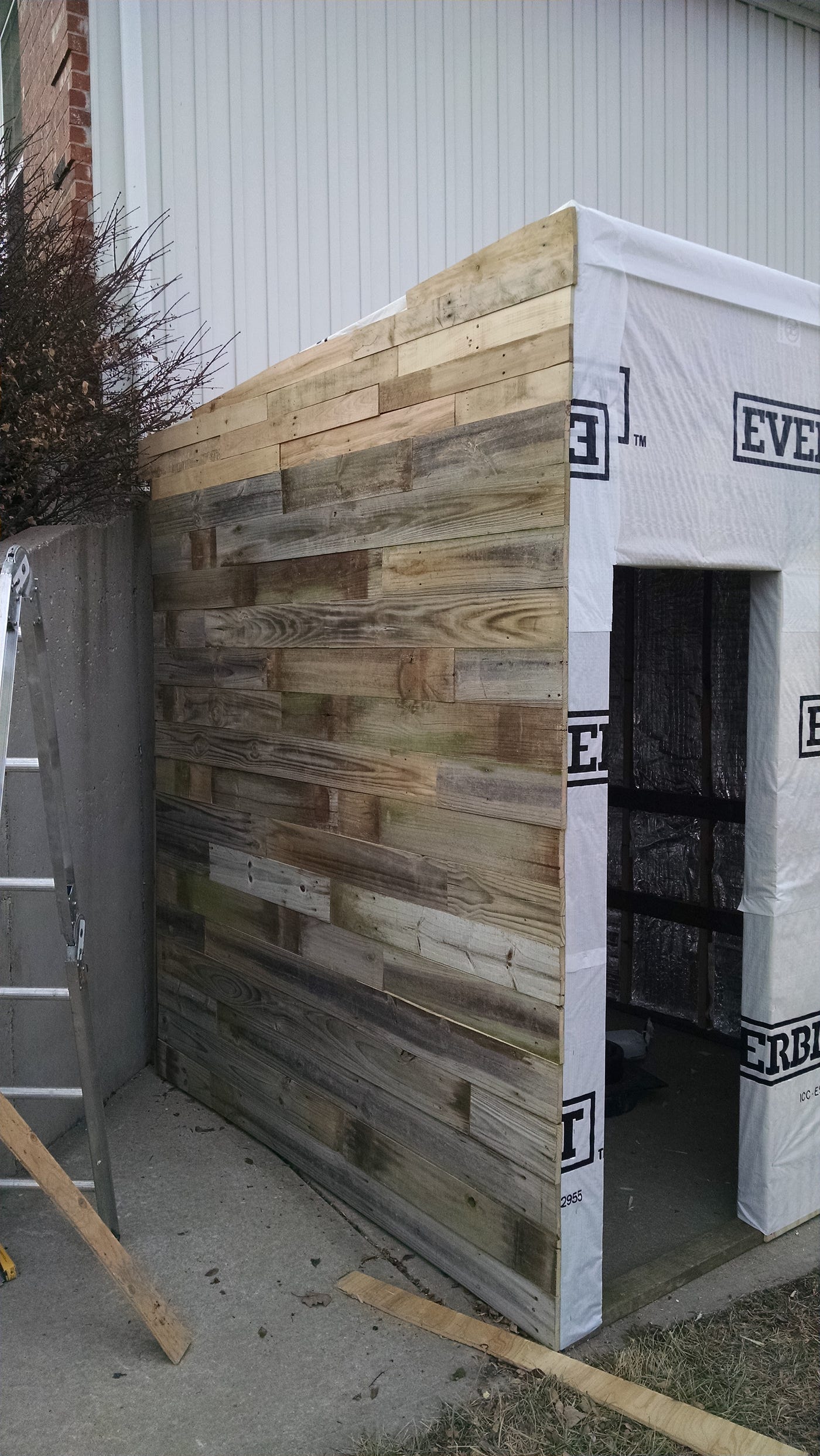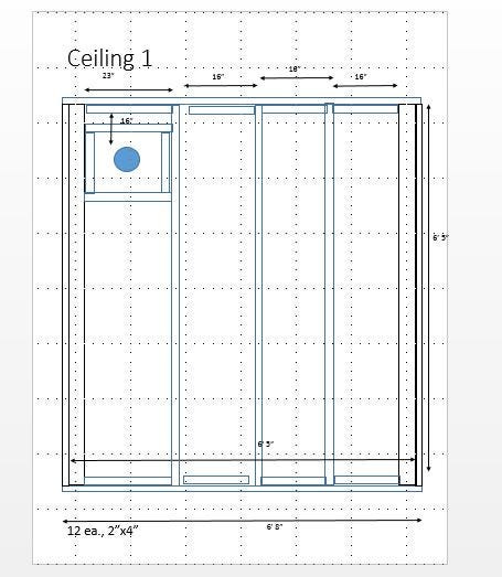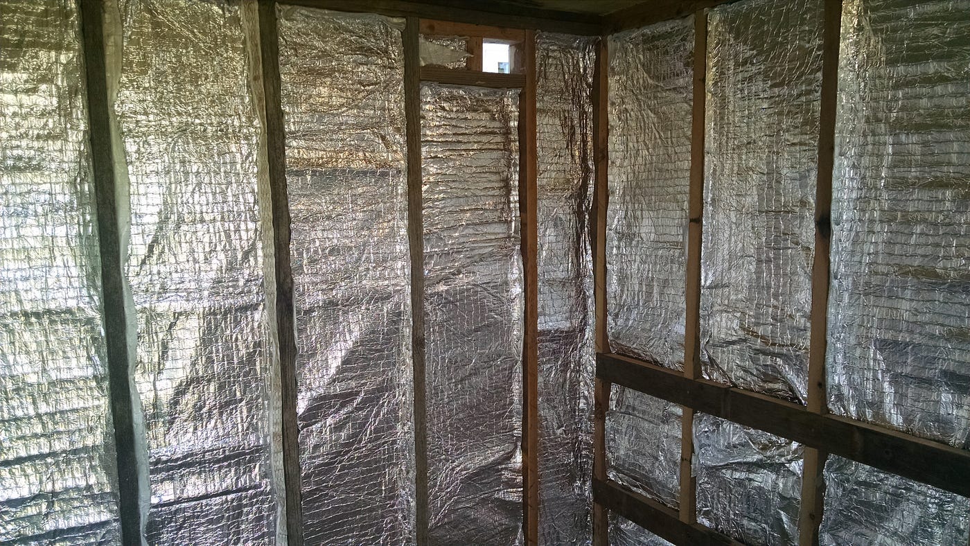 I designed the plans from a variety of sources which included my own ideas, books, and internet layouts. I framed the walls to be 6'6" an all four sides, and 7' tall. The ceiling is framed 2x6"s. The walls are insulated with a layer of polysiocyanurate insulation and a layer of the foam foil insulation. Tinfoil serves as a vapor barrier between the cedar panel boards and the studs. There is plywood just inside the inner and outer paneling which reduces airflow. In the roof, there is a layer of foam foil and six inch thick pink fiberglass insulation (I figure equivalent of R-20 on the sides and R-30 in the ceiling). It heats up fast and stays warm.
