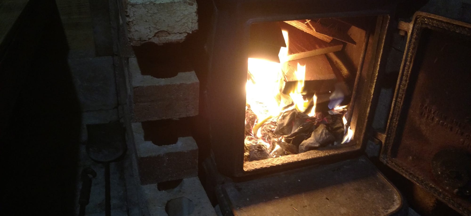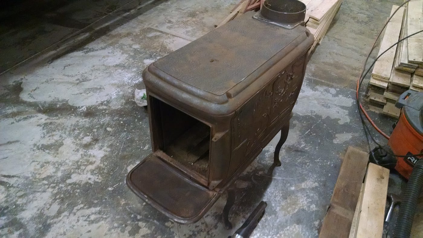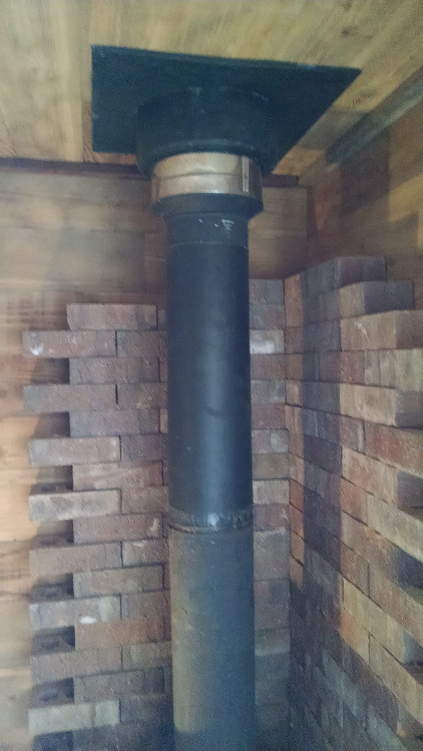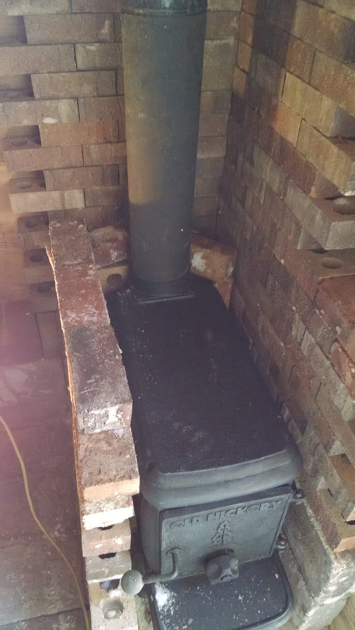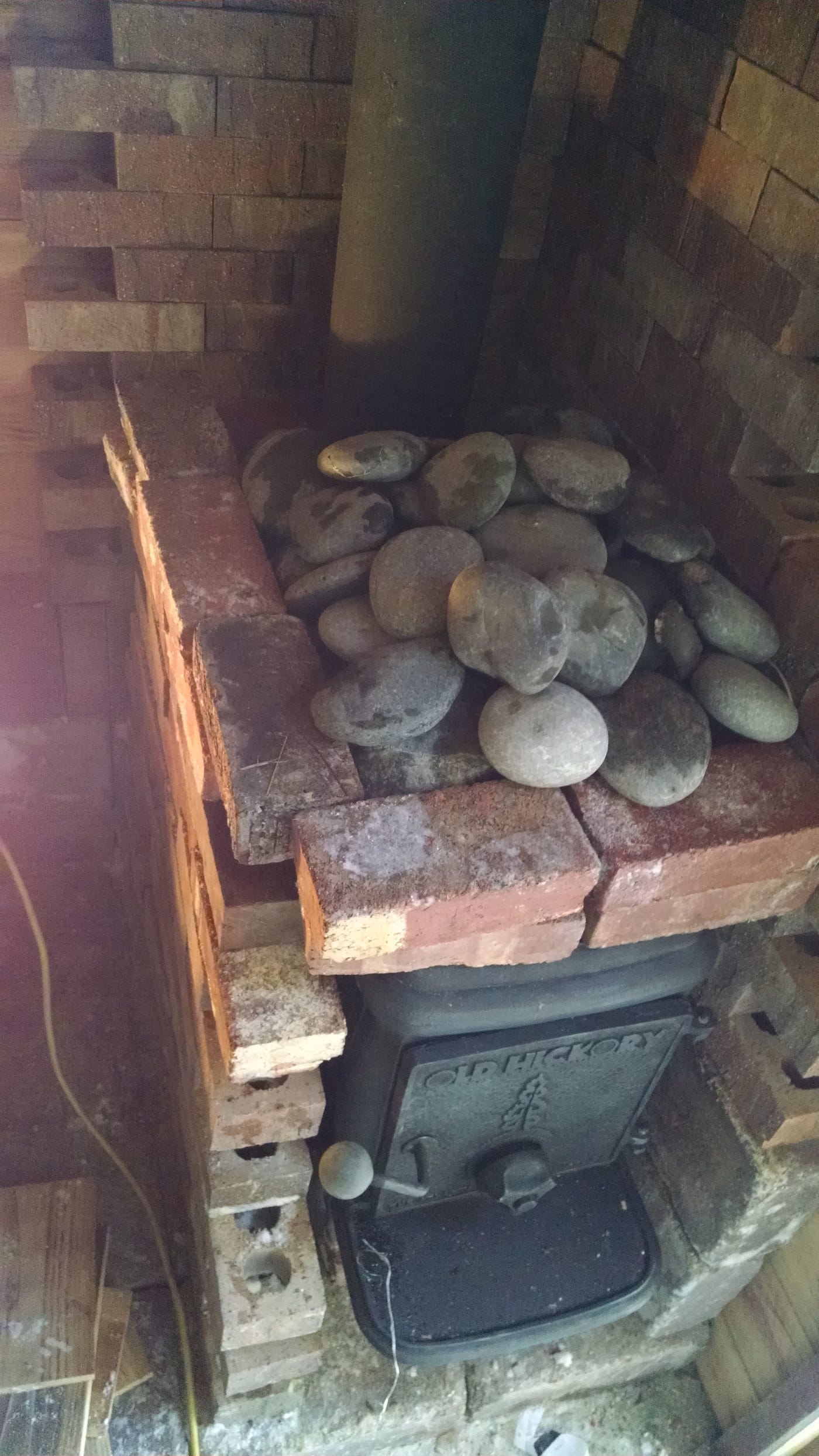 The stove was in rough shape when I got it, but after a couple hours of work, I cleaned up the rust, filled the cracks, applied new stove polish, and put in a new door seal. The stove seems inefficient but still heats fairly well. I used large pavers underneath it, a layer of bricks on three sides, and bricks up the walls to the ceiling next to the chimney. When it gets too hot, it’s tough to cool down, even with the door wide open. Initially, I wanted to buy a Kuuma stove that I would be able to keep for many years. But it didn’t really fit with the reclaimed materials spirit, or my budget for this “temporary” sauna. I figure I will appreciate a better stove that much more when I get it.