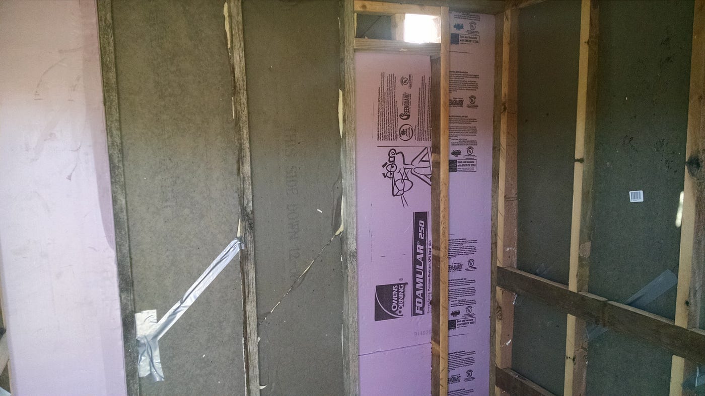 The walls are quite thick. From interior to exterior the layers are: cedar plank, tinfoil vapor barrier, 3/8" plywood, foam foil insulation, poly-foam insulation, 3/8" plywood, house wrap, pine planks. The door is pretty heavy with only one less layer. Fortunately, the ReStore has a huge bin of door hinges and latches. (I could make roughly 476 saunas with what was in the bin.)
