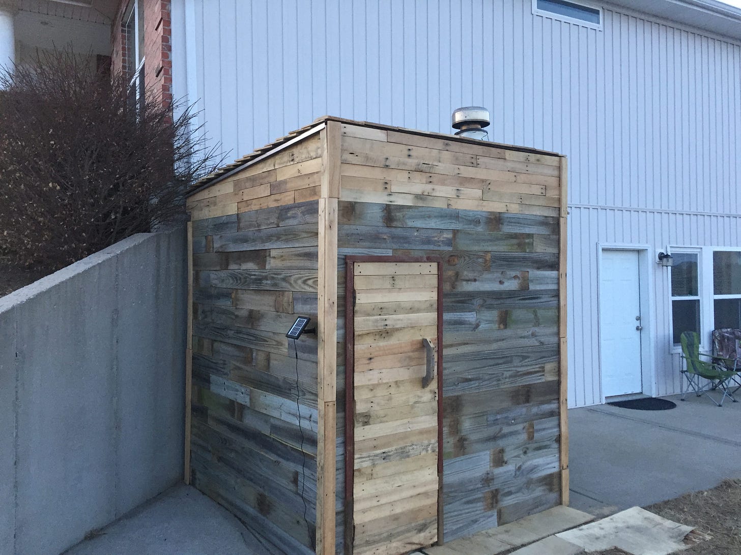 My sauna habits have evolved over time. The first couple years, I was very consistently a three round sauna-goer. I also used to read in the sauna, but no more on either count. After I had moved away from the first one I built, I had less opportunities to go to the sauna, so I tried to make the limited opportunities last. A sauna of less than 90 minutes feels too short. On the weekends, I often go for 2–3 hours. I’m in the hot room as long as I feel comfortable, then out to cool down as long as it takes to be comfortable again. Trying to stretch things does not seem to make a lot of sense to me. Comfort should always be a guide when in the hot room and when cooling down. Go back and forth as many times as you like. And bring water, LOTS of water. In Georgia, I had access to a pool for cold plunging. It was very brisk in the winter, but felt amazing. I do not have a pool or pond available for plunging here in Kansas. In the interest of cool rinsing, I have added hangers to one side of this sauna for outdoor solar showers (see photo below).
