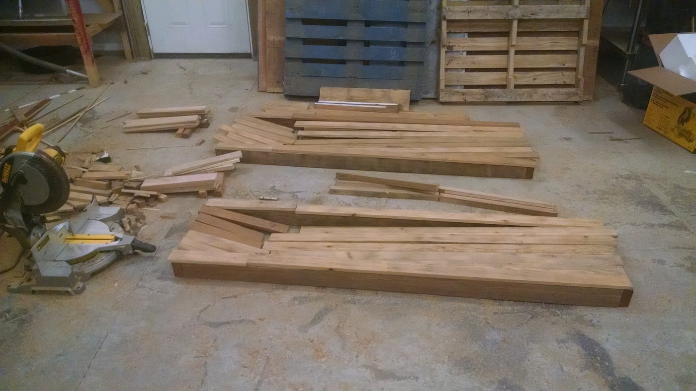 Taking a lesson from the pre-fab sauna, I framed the walls, ceiling, and roof in my workshop using traditional stick frame techniques with 16" on-center stud spacing. I designed the roof with nearly a 10:1 pitch, which in hindsight is probably a little less than I would do again — but it has worked out fine. I had started to cut all the interior wall panels out of pallet slats when I found the cedar boards and used them. I sanded a huge stack of cedar, then ripped them to size and straightness. All of the interior and exterior cedar wall planks were pre-cut in the workshop to rough length before I moved everything to the assembly site. And yes, there was a bit of blood, as I have clumsy fingers and hands.