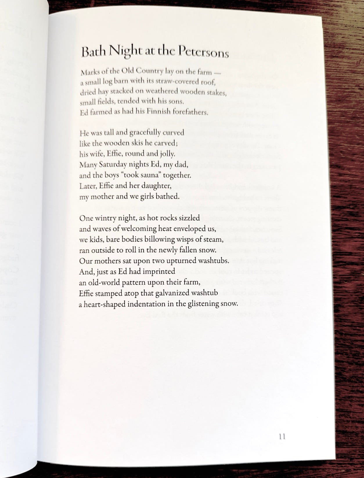 Contrary to what the title might suggest, The Sauna at Twelve-Foot is not primarily about the Finnish steam bath (see the table of contents below). It features stories of rural life, aging, death, and heritage. But, of course, sauna is bound to feature prominently in any telling of Finnish-Americana. You won’t find many technical details like prescribed temperature ranges or cold-plunge schematics, but its humble shack saunas, built with inexpensive pine wood, are just as important for students of sauna. The picture presented is more than just a sterile health practice or high-end spa treatment. It provides the public sauna discourse with much-needed heart and soul that is rooted in a people, Finns, and their place, Finland, the U.P., and northern Minnesota. See the following poem, “Bath Night at the Petersons,” for an example of robust sauna practice grounded in generations of cultural tradition.